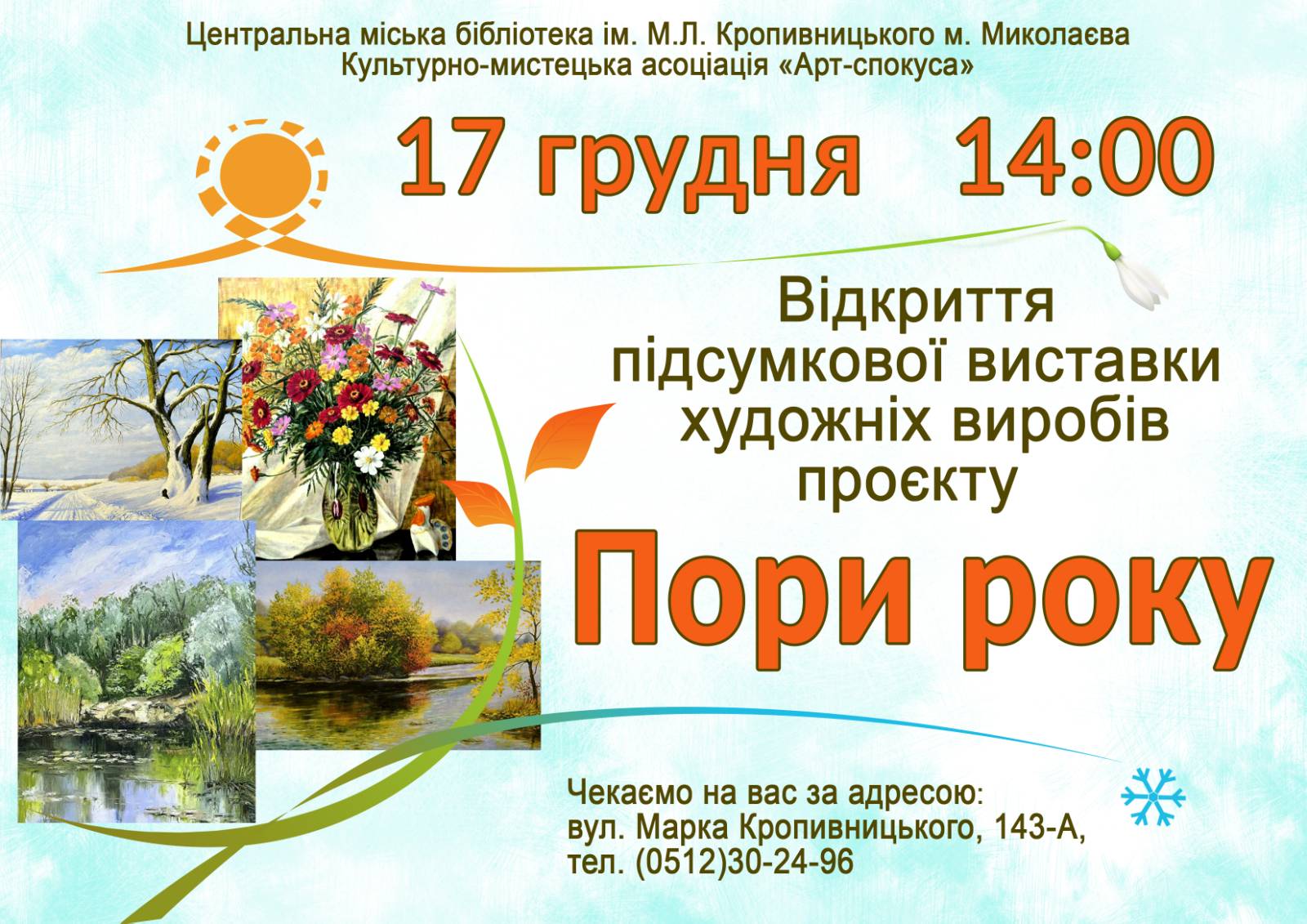 17 грудня о 14:00 відбудеться відкриття підсумкової виставки художніх виробів проєкту «Пори року». Проєкт організовано в межах ювілейної кампанії до 125-річчя Центральної міської бібліотеки ім. М.Л. Кропивницького у співпраці з ГО КМА «Арт-спокуса».