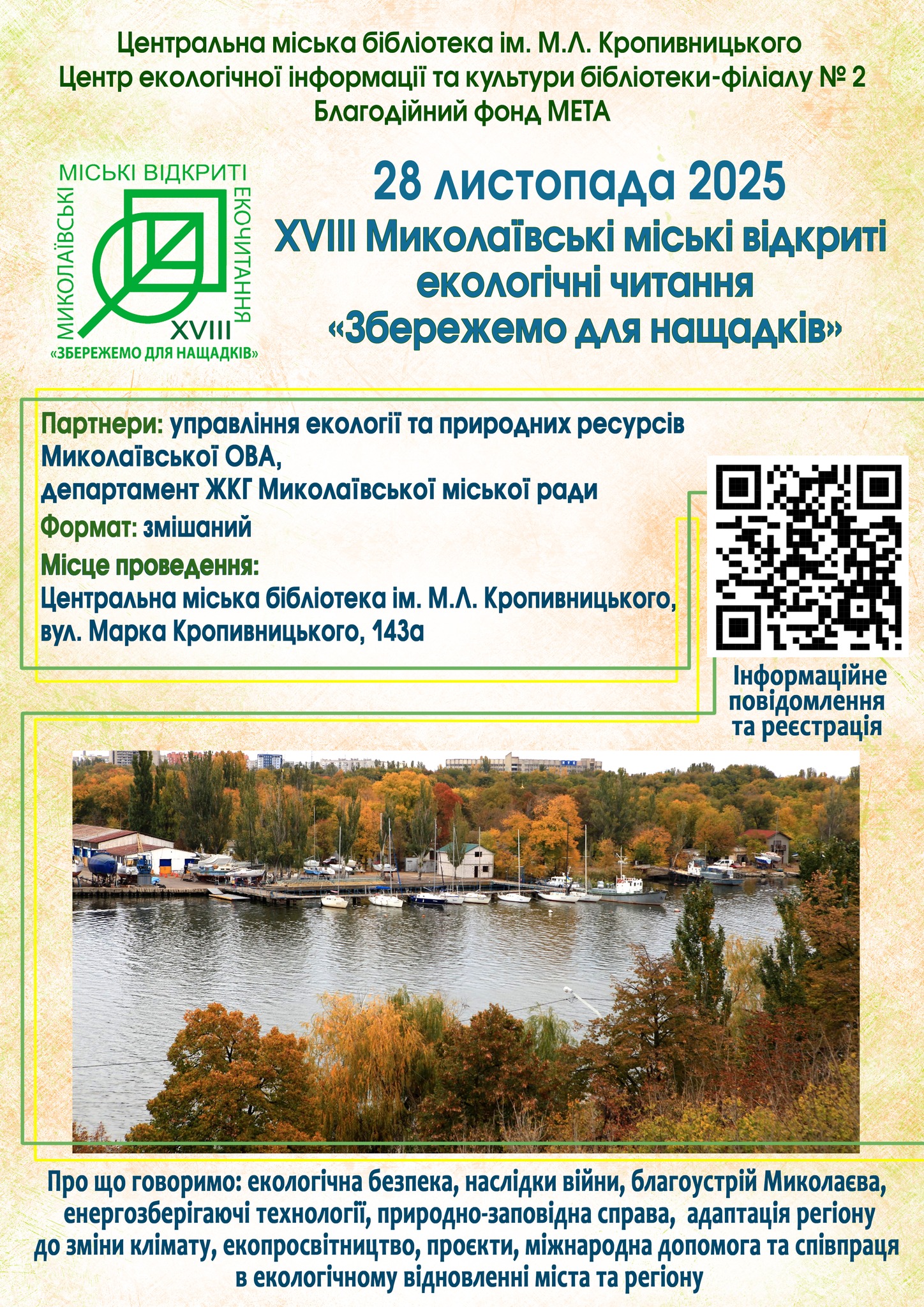 До уваги всіх зацікавлених! Триває реєстрація на XVIII Миколаївські міські екологічні читання "Збережемо для нащадків".  Будемо раді бачити в стінах бібліотеки!