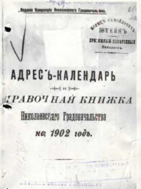 Адресъ-календарь и справочная книжка Николаевскаго Градоначальства на 1902 годъ [Текст] / сост. В. Р. Лифанов. - Николаевъ : Изданіе Канцеляріи Николаевскаго Градоначальника ; Русская типо-литографія, 1901. - 214 с. : ил. Закачати програму для перегляду файлу можна тут |