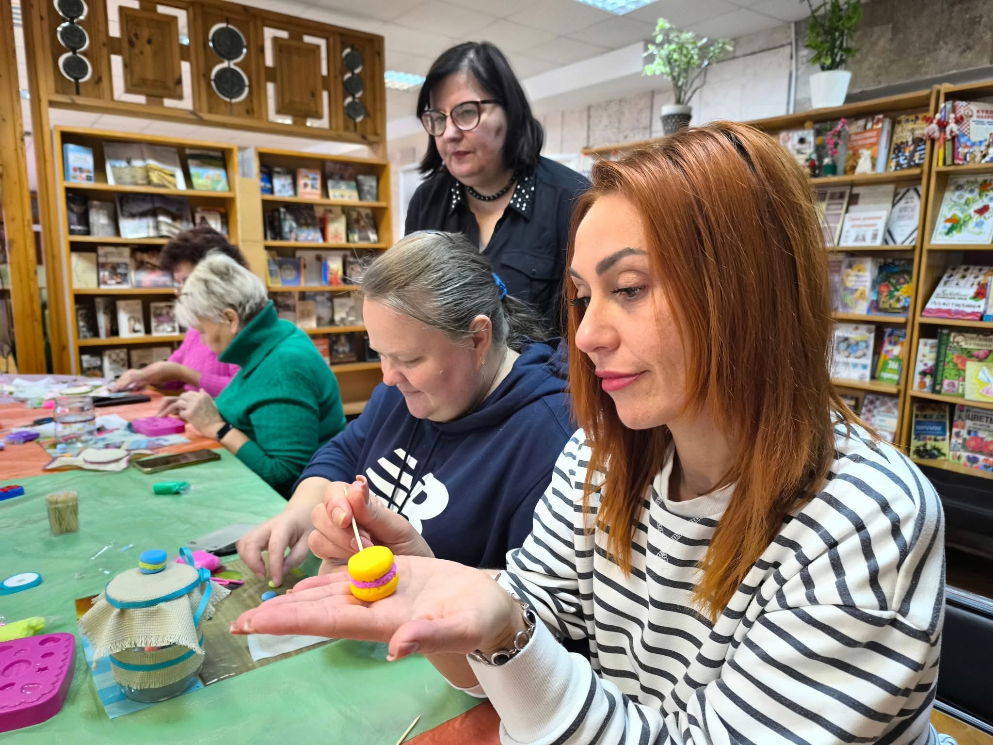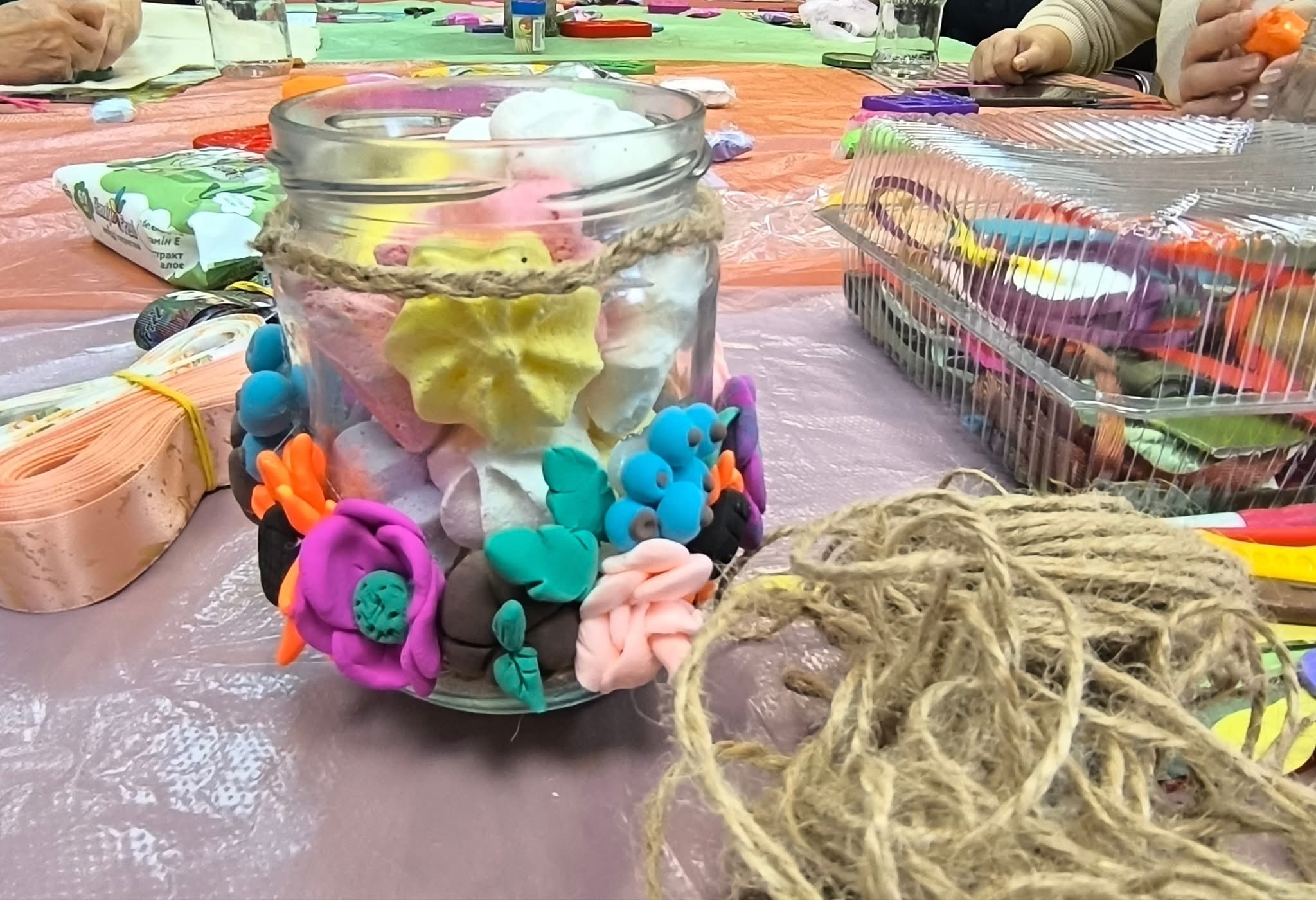 Учасниці створювали декоративні елементи — квіти, листя, ягоди, гарбузики, горобину, полуницю, тістечка та навіть цукерки. Потім прикріплювали їх до баночок за допомогою термопістолета, оздоблювали кришки тканиною й стрічками.