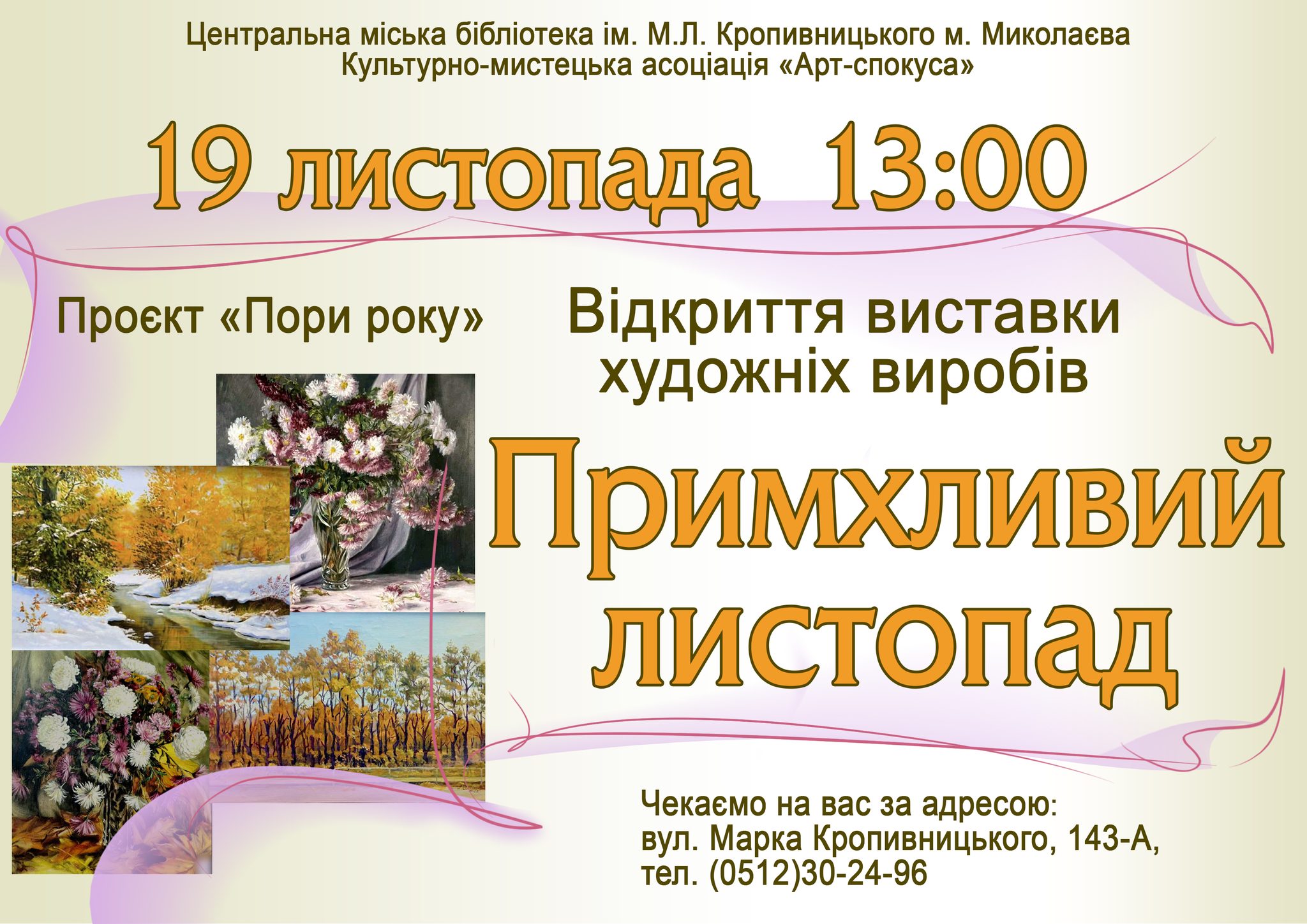 19 листопада о 13:00 запрошуємо на відкриття виставки художніх виробів «Примхливий листопад»! Це вже восьма подія мистецького проєкту «Пори року».