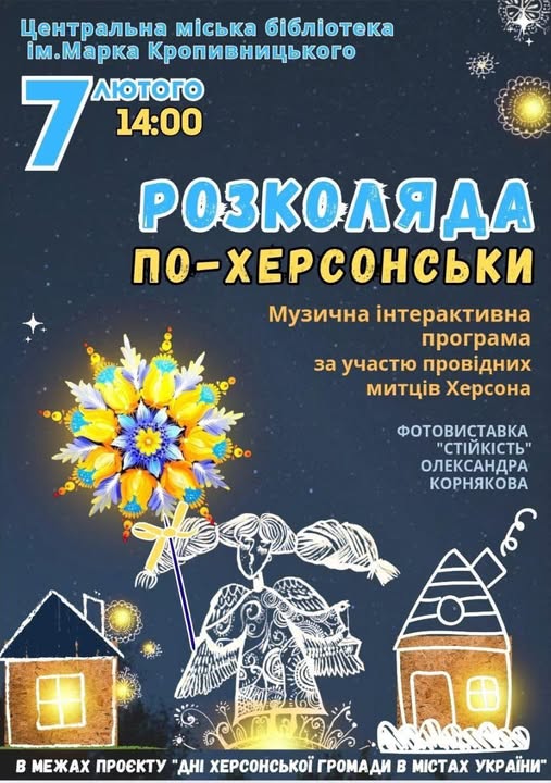 Друзі! Запрошуємо вас 7 лютого о 14:00 на музичну інтерактивну програмау провідних митців Херсона. Це особлива культурна подія, присвячена давній українській традиції Розколяди-обрядовому прощанню з різдвяно-новорічним циклом свят.