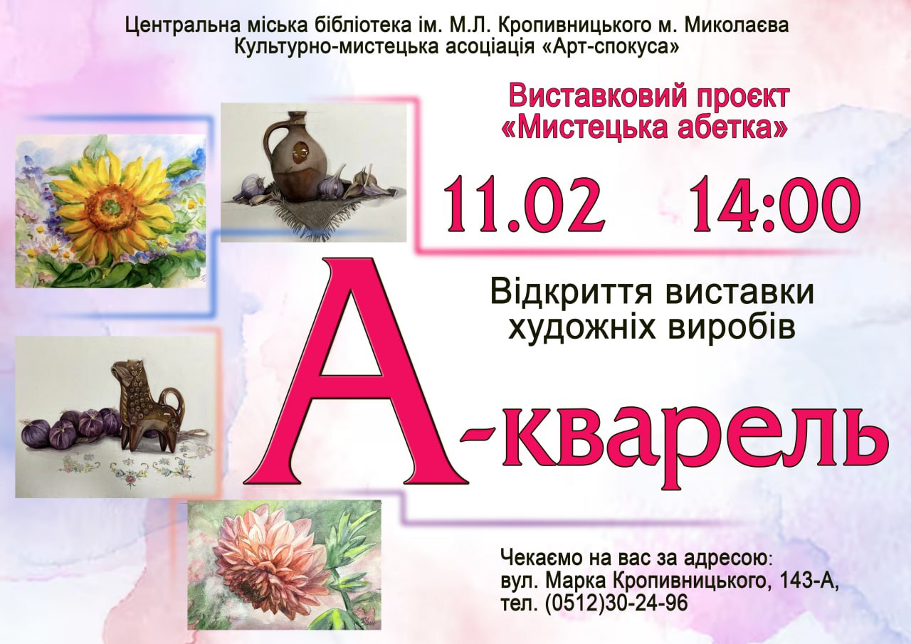 Запрошуємо 11 лютого о 14:00 на презентацію нового виставкового проєкту «Мистецька абетка»! Першою подією проєкту стане відкриття виставки художніх виробів «А-акварель», організованої у співпраці з ГО КМА «Арт-спокуса».